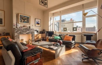 SOUS OFFRE. Dans une rue calme et agréable, ce très bel appartement se situe au 5è et dernier étage dans un immeuble de caractère de style "Art Déco" construit en 1937. Il offre une superficie habitable de +/-90m²: hall d'entrée avec porte blindée, séjour/salle à manger plein sud (avec balcon) +/-32m², cuisine américaine full équipée, 2 belles chambres (+/-12m² et 16m²) à l'arrière donnant sur une terrasse +/-9m², wc séparé, 1 salle de douches. 2 caves. Chaudière au gaz individuelle. Electricité en conformité. PEB G. Vues avant et arrière dégagées. Appartement très lumineux et en très bon état. Contact pour visites: 0477,500,509.